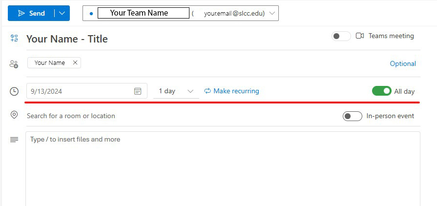 6. If the event is for an entire day or multiple days toggle the "All day" setting. Change the event time to match when you would like this event to be scheduled.